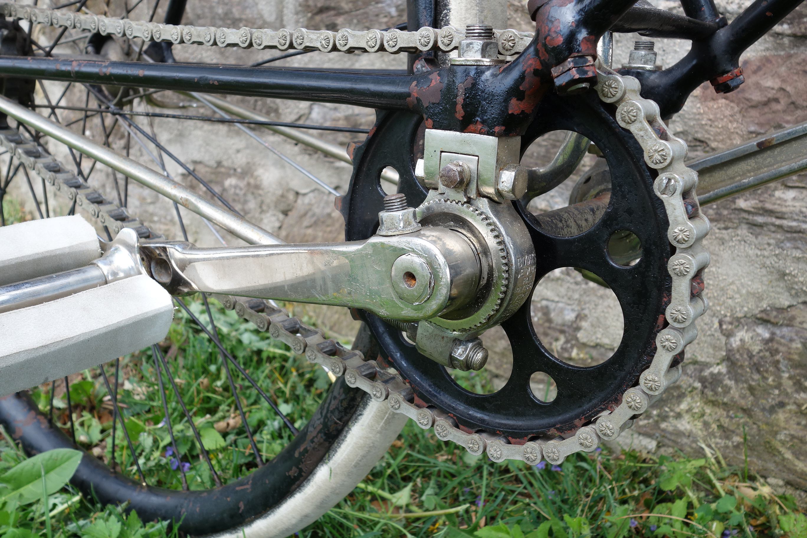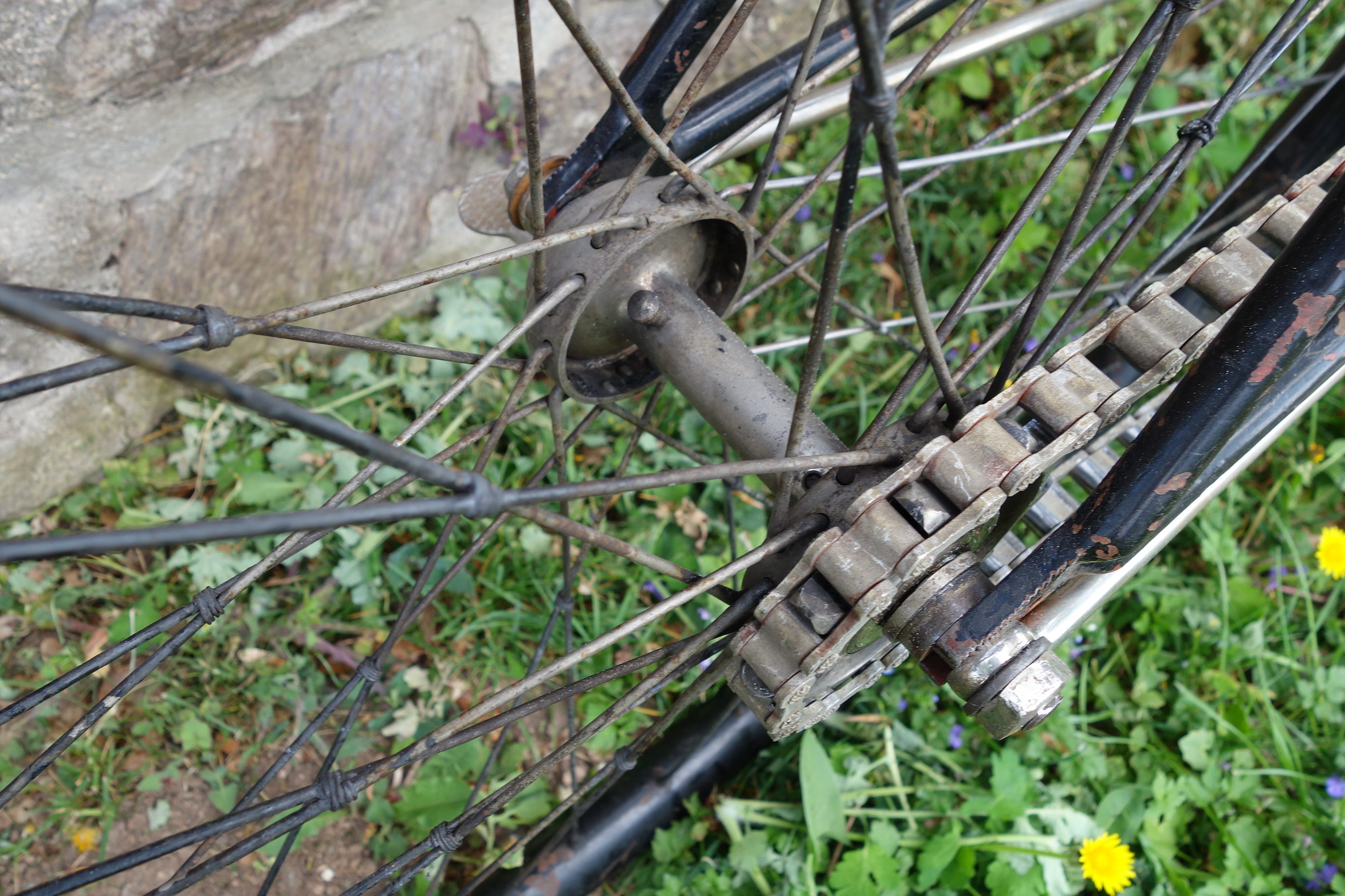 Ivos Victor ist ein klassischer Fall von Sammlerfrevel. Viele, noch im originalen Nickel erhaltene Teile wie die Naben, Bremse ,Speichen im Originallack und Nickel zeigen in welchem Traumzustand das Rad gewesen sein muss bevor der Vorbesitzer begann ettliche Teile neu zu verchromen (anstatt zu vernickeln) und den Rahmen zu lackieren. Die Verchromung wurde zwischenzeitlich wieder rückgängig gemacht.