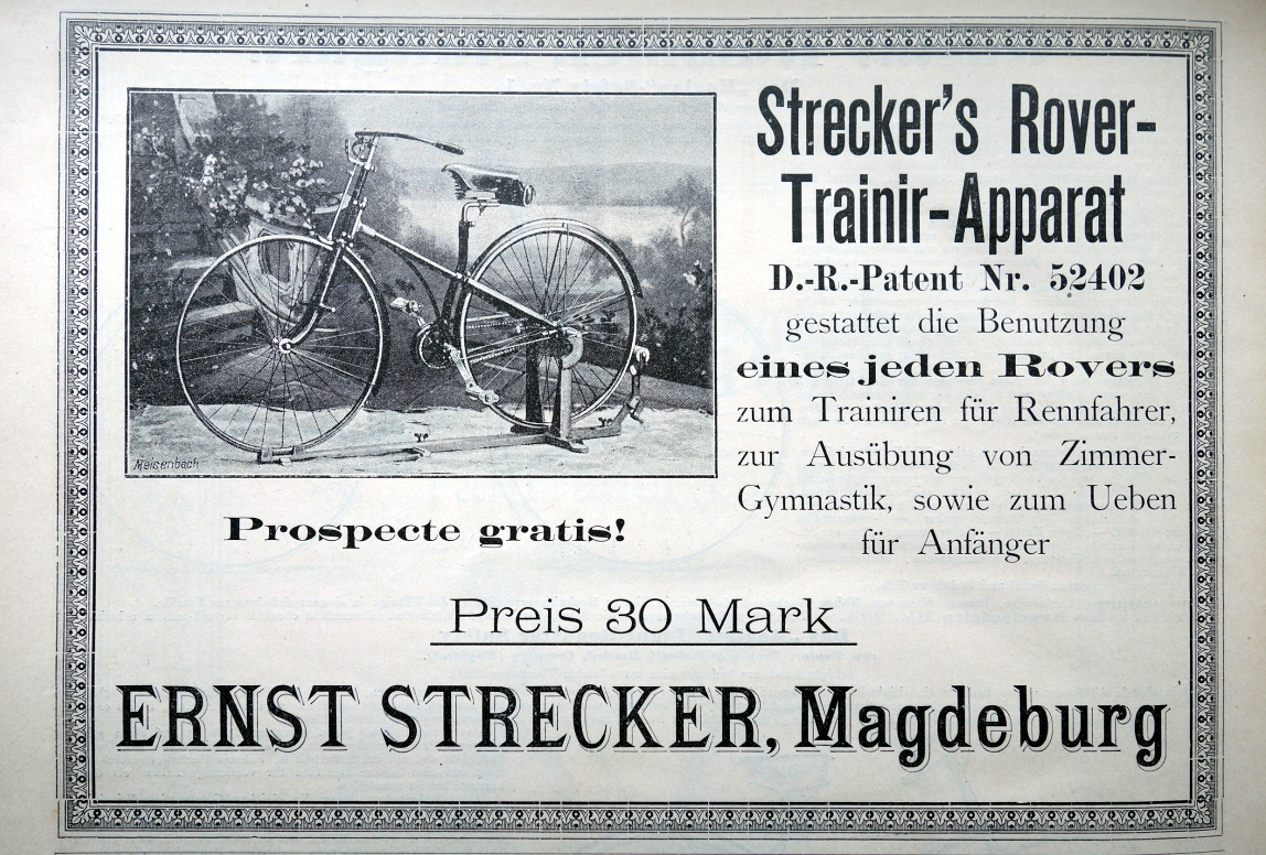 Wir hingegen können unseren geneigten Lesern den patentierten Streckerschen Rover-Trainierapparat wärmstens an Herz legen. Herr Strecker aus Magdeburg hat einen speziellen Apparat für Dreiräder entwickelt der dem Autor während langer Wintertage beste Dienste erwiesen hat. Wobei das zusätzlich erhältliche Kilometerschlagwerk als notwendiger Anreiz zur Überlistung des inneren Schweinehunds nicht zu unterschätzen ist.