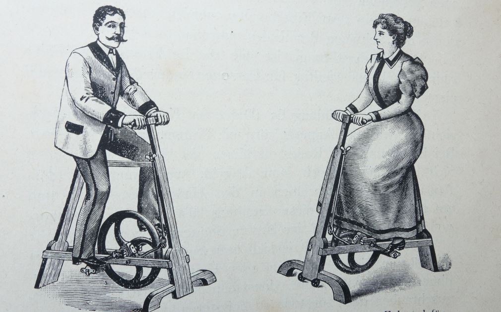 Fetten Herren und korpulenten Damen empfiehlt Dr. Fressel das Zimmerfahrrad der Holzwarenfabrik Hildburghausen zum Training . Hergestellt aus Hartholz ausgestattet mit einem Schwungrade von 23 Kilo, einer Backenbremse und wahlweise einem Entfernungsmesser( (Cylometer). Das Gerät ist mittels der Backenbremse für jede Kraftäufserung einstellbar.