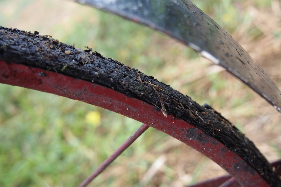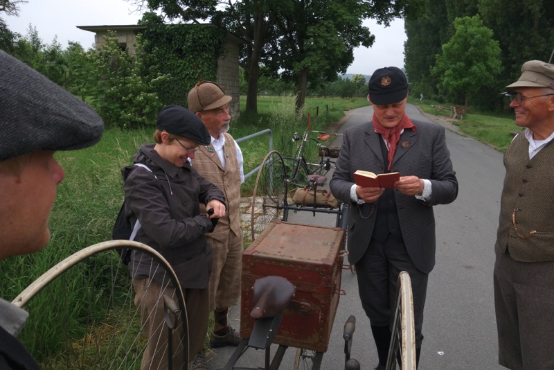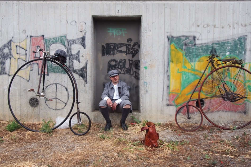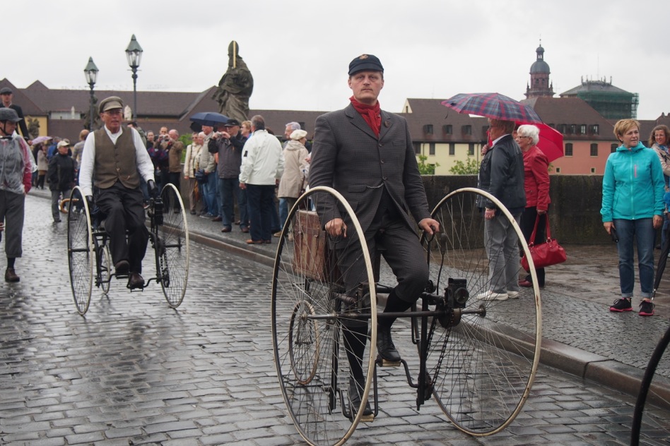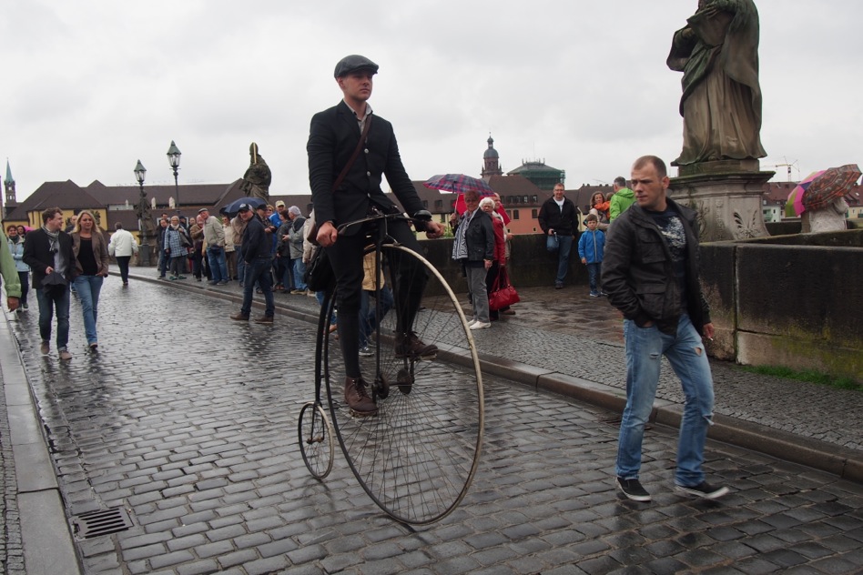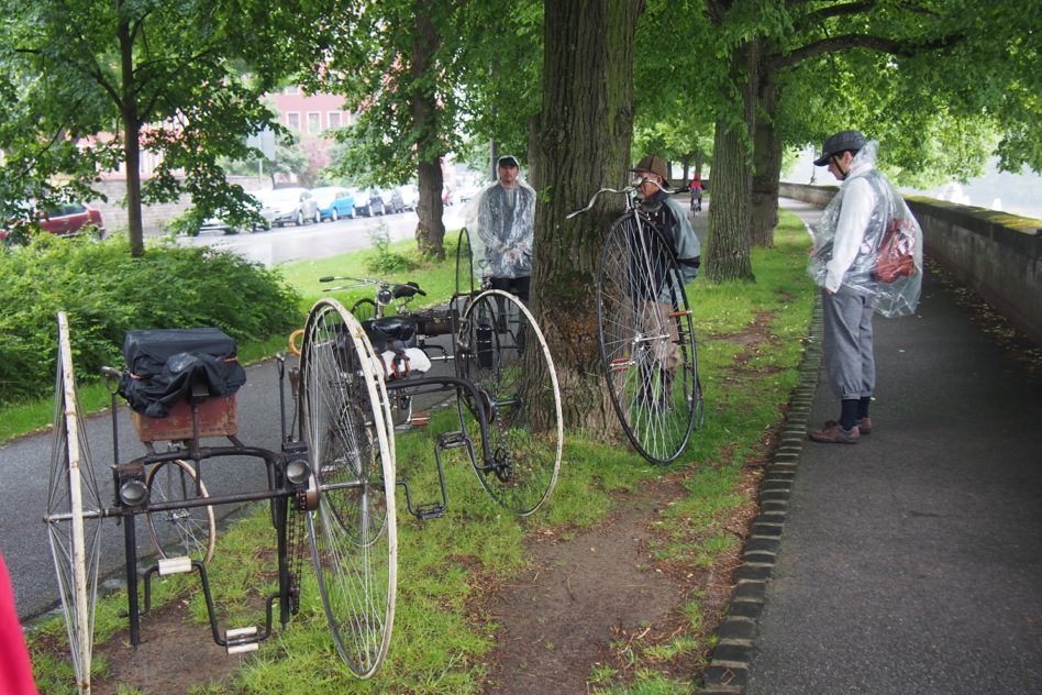 Von Würzburg gings im Regen weiter Richtung Erlabrunn, mit einem Zwischenstopp unter einer Eisenbahnbrücke, um die Reifen des Rotary nochmals zu prüfen. Nach Helges fachlichem Rat wurde der Zustand der in der Felge verbliebenen Gummireste als „stabilisiert“ bewertet. Bei der Weiterfahrt wurde Max erstmals von seinem Hochrad abgeworfen und landete im Schlamm. Dem Rad geschah aber nichts.