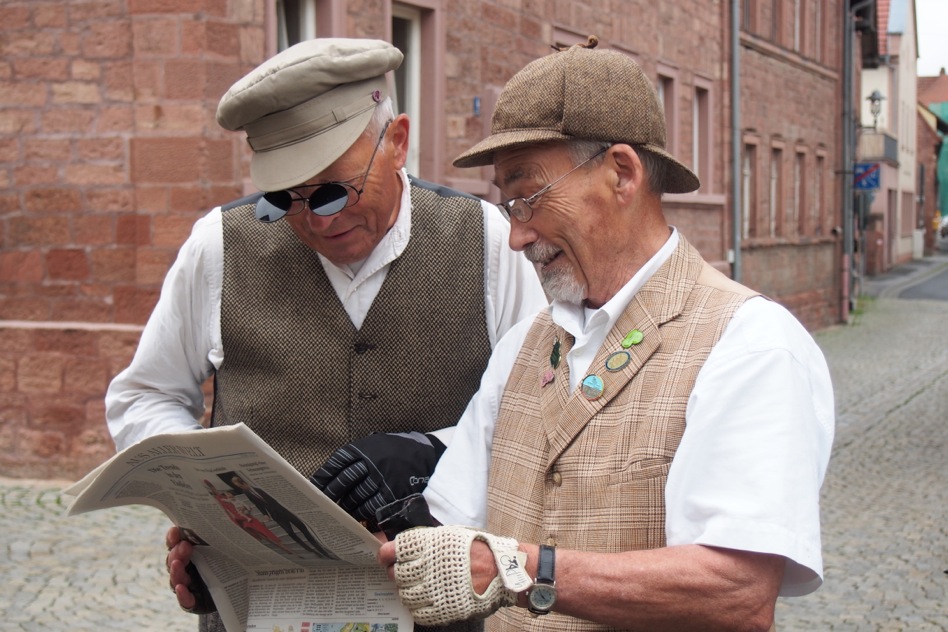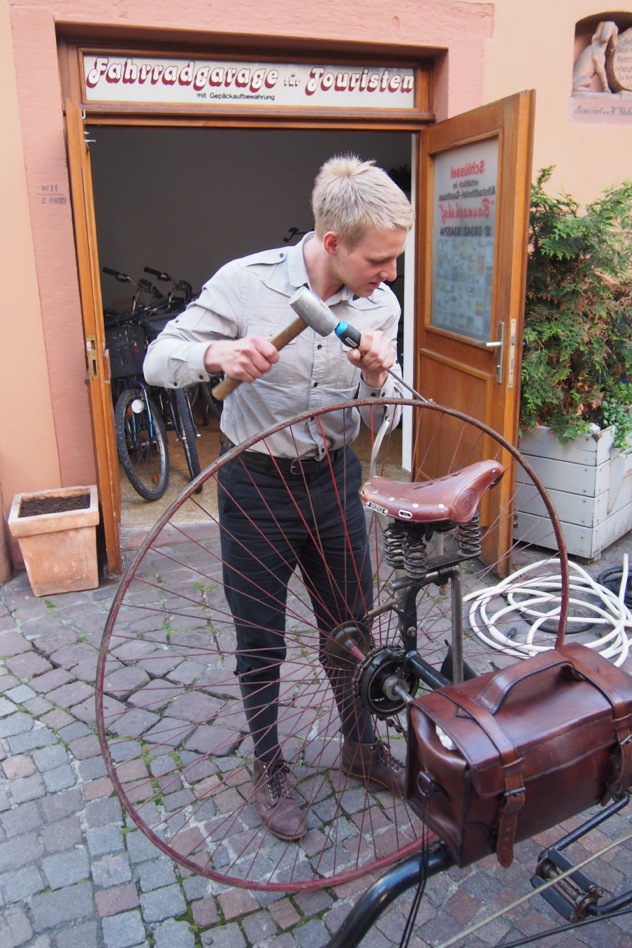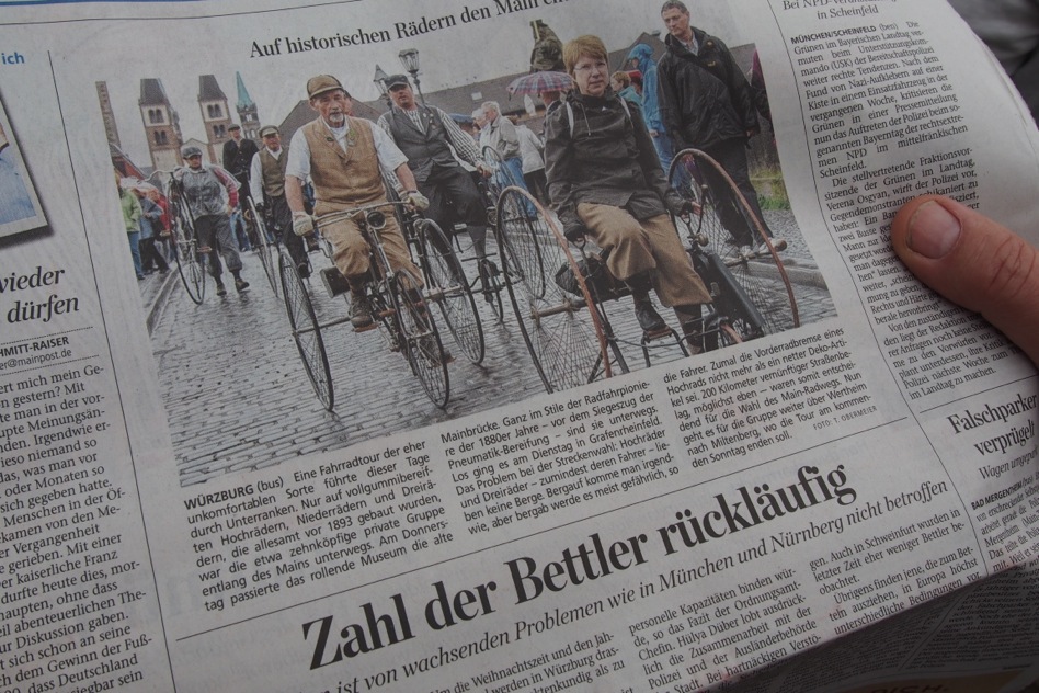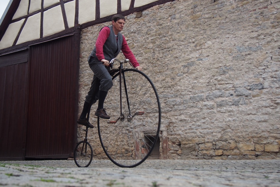Die vom Wetterdienst angekündigte Schönwetterfront – wir nennen sie liebevoll die „fränkische Hitzewelle“ – blieb auch am vierten Tag unserer Tour aus. Knappe 16 Grad, wenig Wind und trockene Straßen erwarteten uns, und viele wünschten sich Handschuhe statt Sonnenbrillen… Die heutige Strecke umfasste ca. 17 Kilometer, weniger als an den Tagen zuvor, da wir am Nachmittag unsere Automobile nachholen mussten. Nichts destotrotz verging einige Zeit bis wir Karlstadt erreichten. Aufgehalten durch neugierige Pneumatik-Fahrer, Fotografen und Helges Rotary-Reifen, der den Zustand der „Stabilität“ benahe verlassen hätte und am Weg liegengeblieben wäre, brauchten wir ca. drei Stunden für die Tagesetappe. Danach brachten wir die Fahrräder nach Wertheim. Dort wurde das Rotary endlich doch noch mit neuen Reifen bestückt. Von Wertheim brechen wir morgen Richtung Miltenberg, dem Ziel der Tour auf.