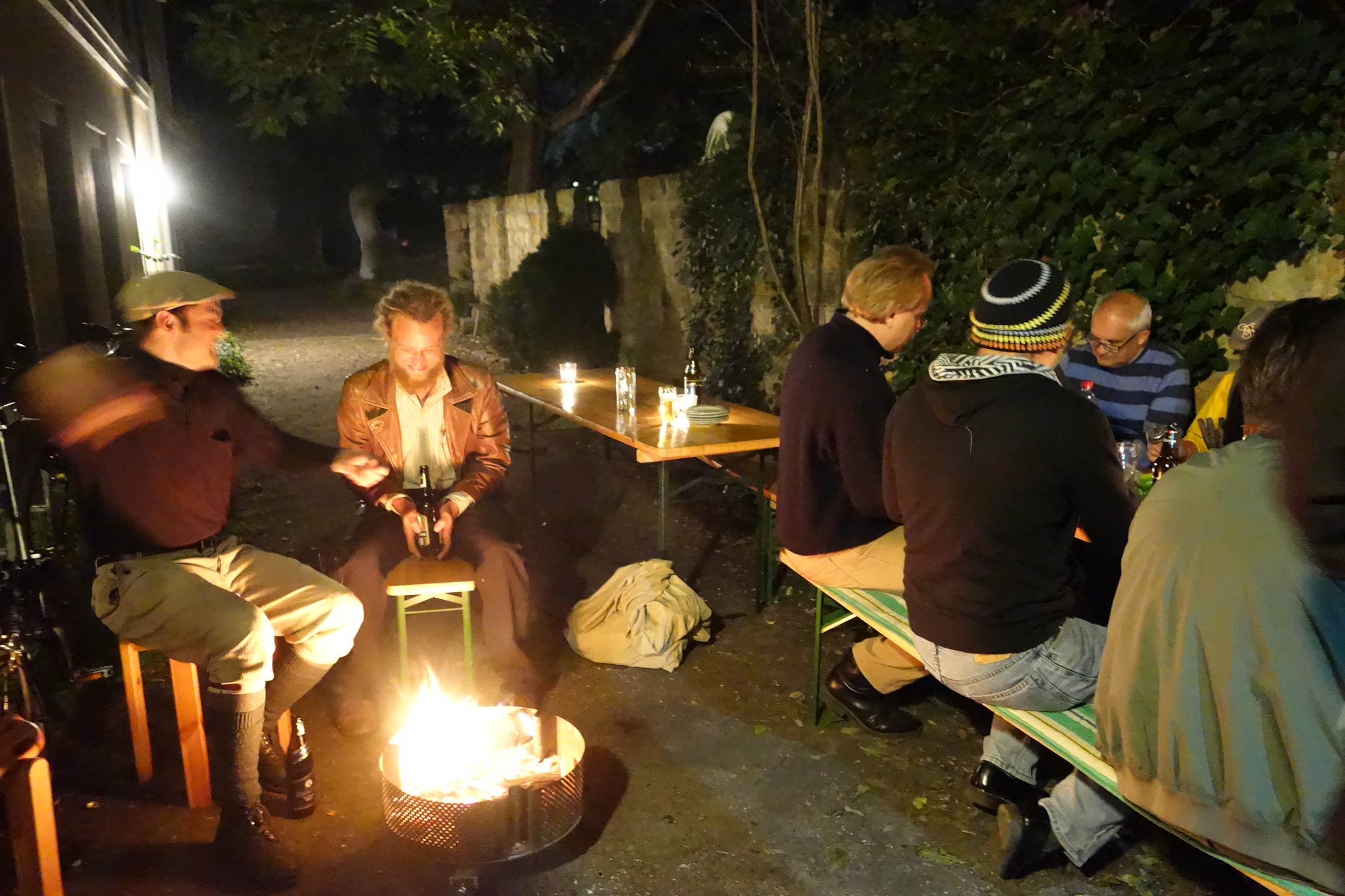 Am Tag der deutschen Einheit haben uns Myriaden von kleinen schwarzen Ameisen – genannt Touristen – sofort zur Fahrradausstellung in den Stallhof getrieben. Diese „Tierchen“ waren auch schuld daran, daß wir abends in keiner Kneipe einen Platz für mehr als 2 Personen fanden. So mußten wir improvisieren und draußen am offenen Feuer grillen. Gemütlich, aber saukalt.