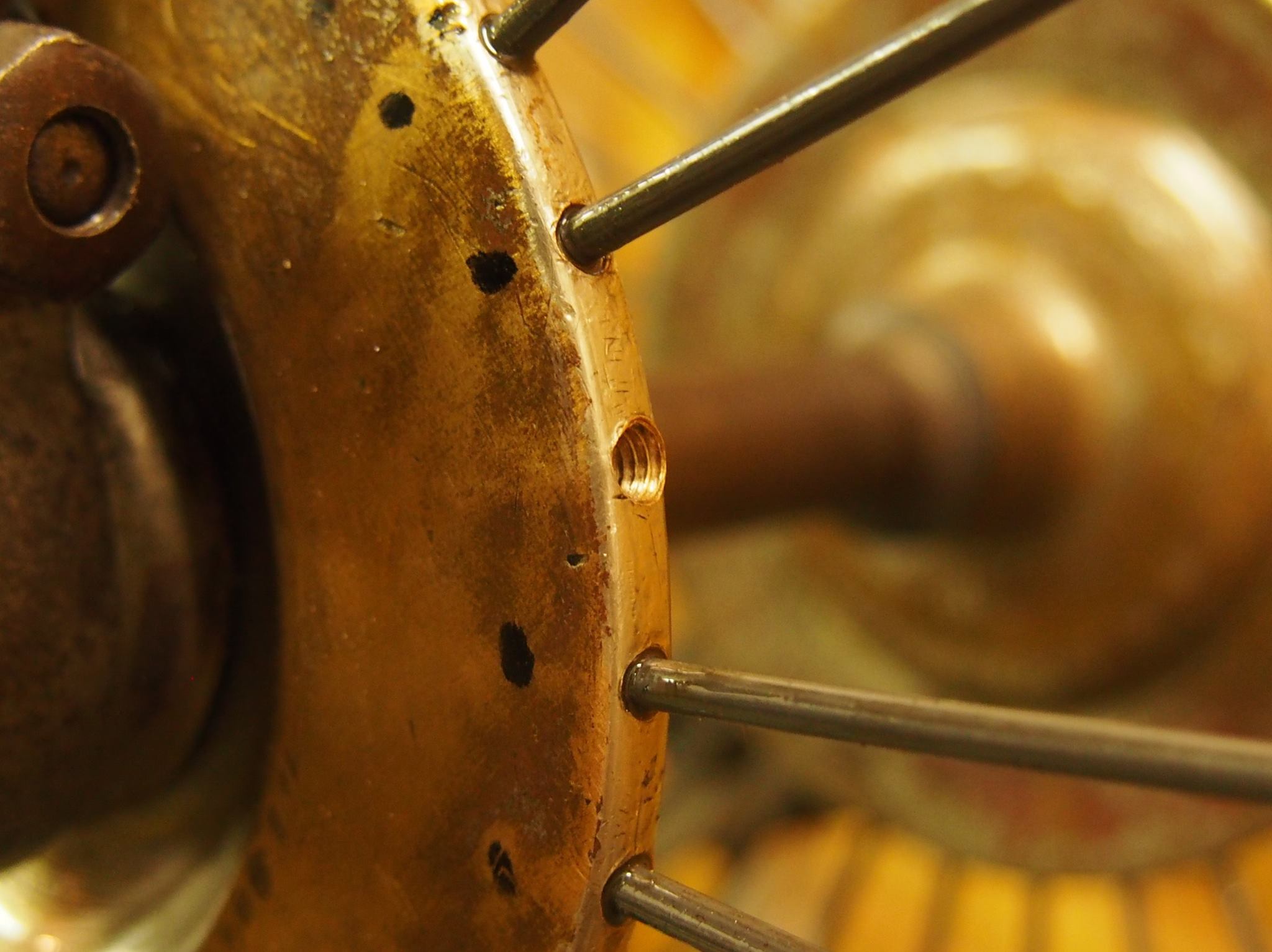 - Speichen: Einige der originalen 1/8″ Dickendspeichen waren schon so rostig, dass sie beim Drehen brachen. Ein paar sind schon bei einer früheren Reparatur ersetzt worden, allerdings wurden dabei die Speichenlöcher in der Nabe auf 5mm aufgebohrt und entsprechend dicke Speichen eingesetzt.