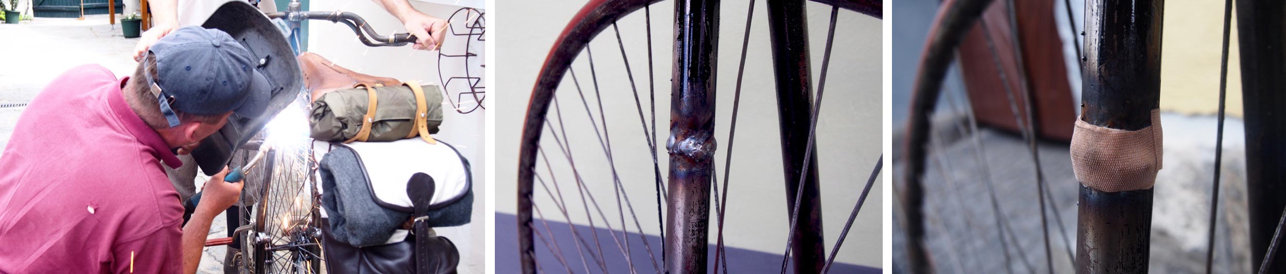 Reparatur des Tages: Gabelbruch beim Kangaroo, wieder geschweisst im Hof des Heurigen Höllmüller in Spitz (vielen Dank an Florian). Ansonsten gabs nur Kleinigkeiten (Reifenkleben, etc.) und Geralds Hose, die den Strapazen nicht mehr standhielt.